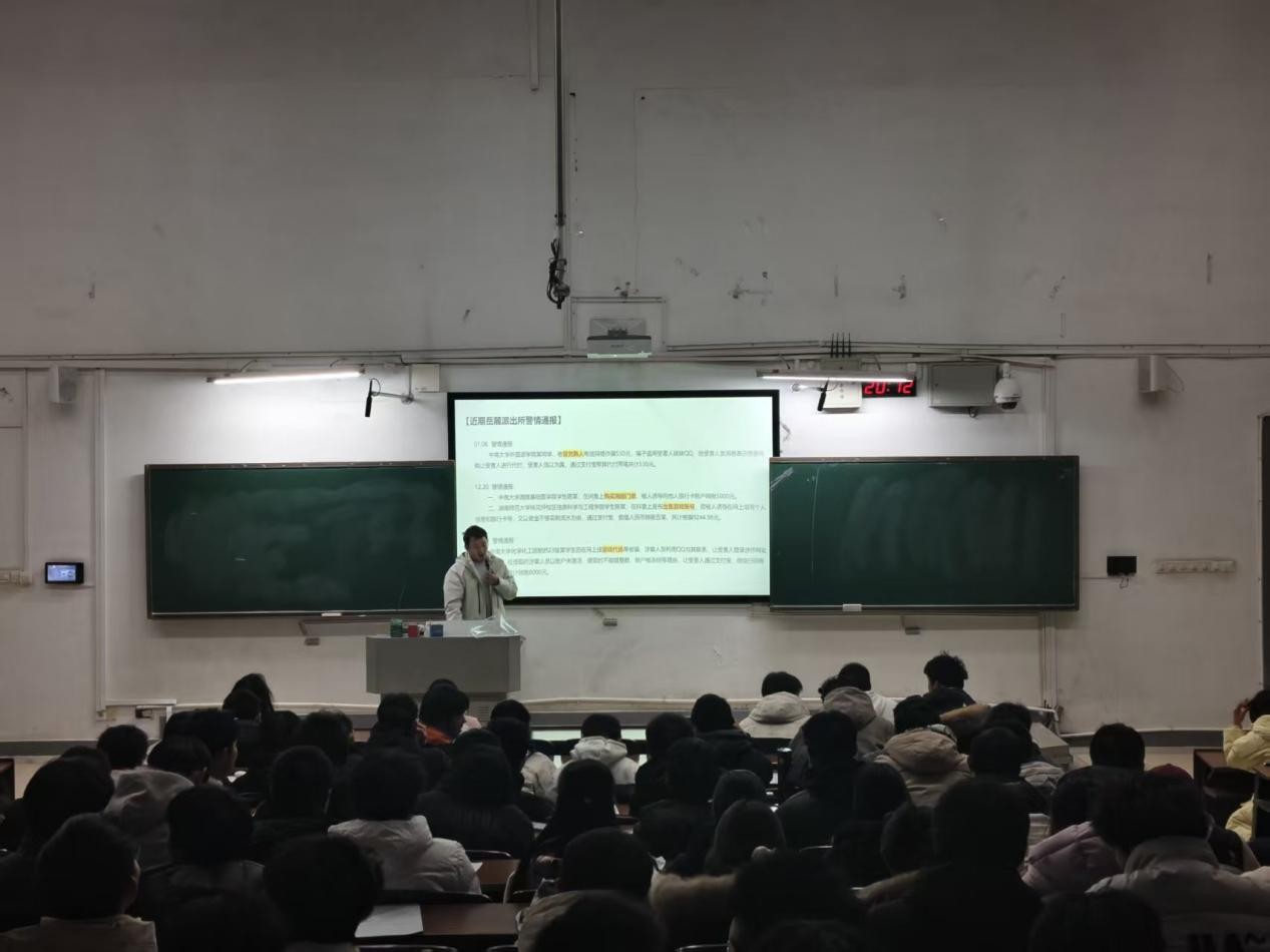 1月8日晚,为进一步强化思想引领,提升安全意识,规范学风考纪,公司组织召开本科2025级“筑牢底线红线 护航成长之路”主题年级大会。会议围绕安全教育、诚信应考教育两大核心内容展开,由本科2025级辅导员胡煊赫主讲。