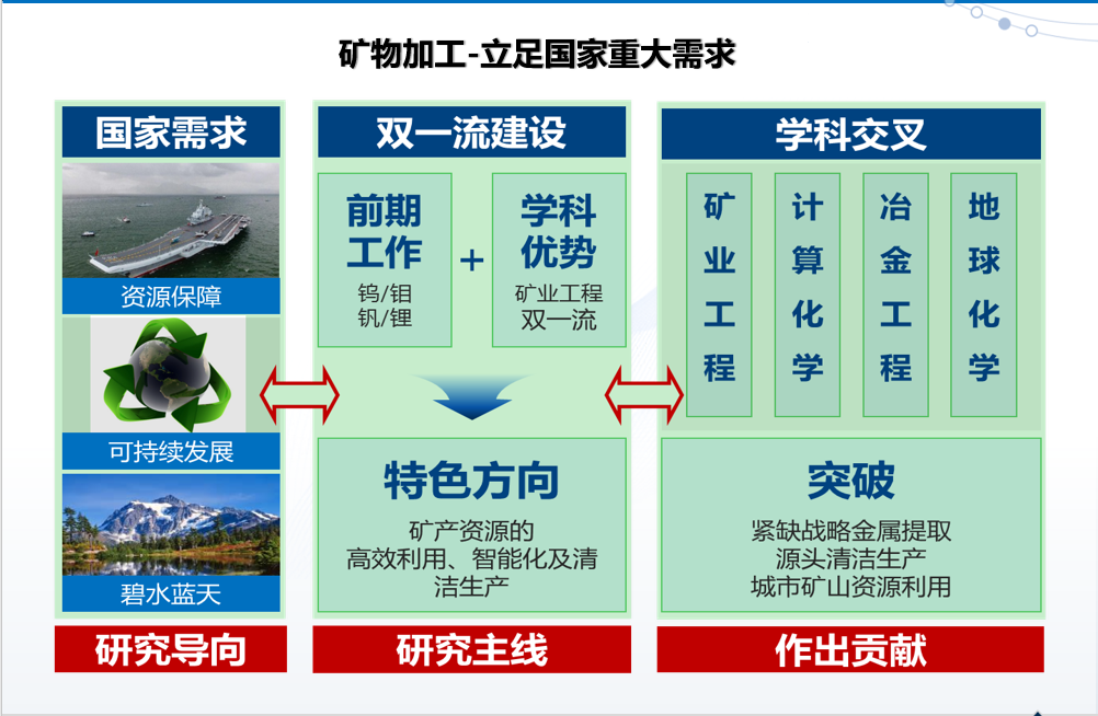 核心课程:物理化学、流体力学、资源加工学、资源加工研究方法、资源加工设备、资源加工工程设计、资源加工过程智能控制、矿冶环境工程、矿产资源综合利用、钢铁冶金学等。