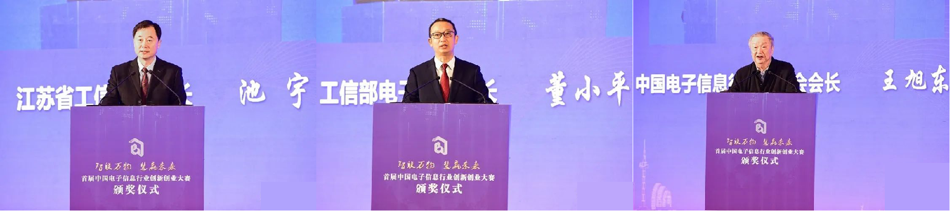 图2 中国电子信息行业联合会王旭东会长、工信部电子司董小平副司长和苏省省工信厅池宇副厅长现场致辞