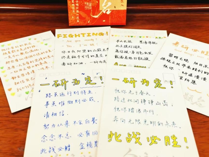此外,为增强考生信心,公司为全体考研学子准备了寓意美好的暖心加油礼包,内含考试用具、果冻橙、旺仔牛奶和薯片等礼品,象征心想事成、好运相伴与温暖常在。同时,辅导员吴宗晟及员工干部为85名考研学子书写祝福卡,期盼2022级考研生“研”途有梦,一战成“硕”。