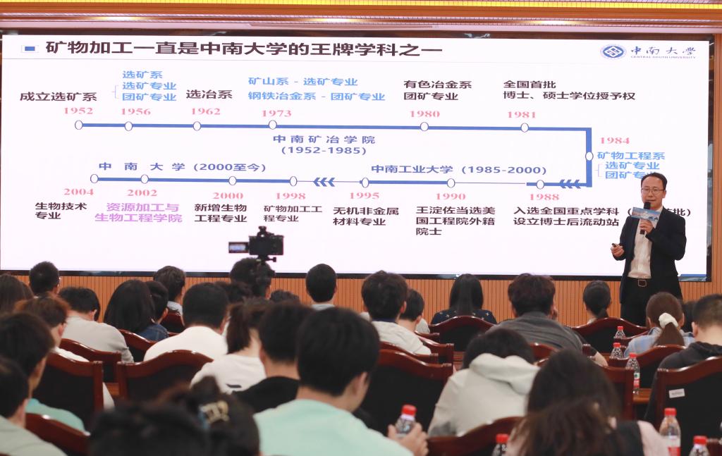 “‘一不留神,就干了一辈子’的王淀佐院士从15岁接触选矿,走过70多个春秋创立的浮选剂结构理论,拉开了中国选矿腾飞的序幕。”“邱冠周院士与共和国同龄,‘利用生物技术的钥匙打开资源利用大门’,将我国的生物冶金领域提升到新的高度。”“姜涛院士与钢铁结下了‘不解之缘’,同学们称他是‘钢铁侠’,支撑了我国不锈钢工业的高质量发展。”宣讲团的成员们带领大家追随前辈科学家们的奋斗足迹,感受他们走过的光辉历程。